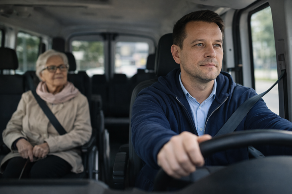Dlaczego to ważne? Dobra firma od razu dopyta o warunki wejścia/wyjścia, schody, windę, wózek i czas oczekiwania. RTPartner działa jako przewoźnik specjalistyczny w Małopolsce i buduje usługę wokół bezpieczeństwa, punktualności i opieki, więc taki „scenariusz” jest podstawą do sensownego zaplanowania kursu.